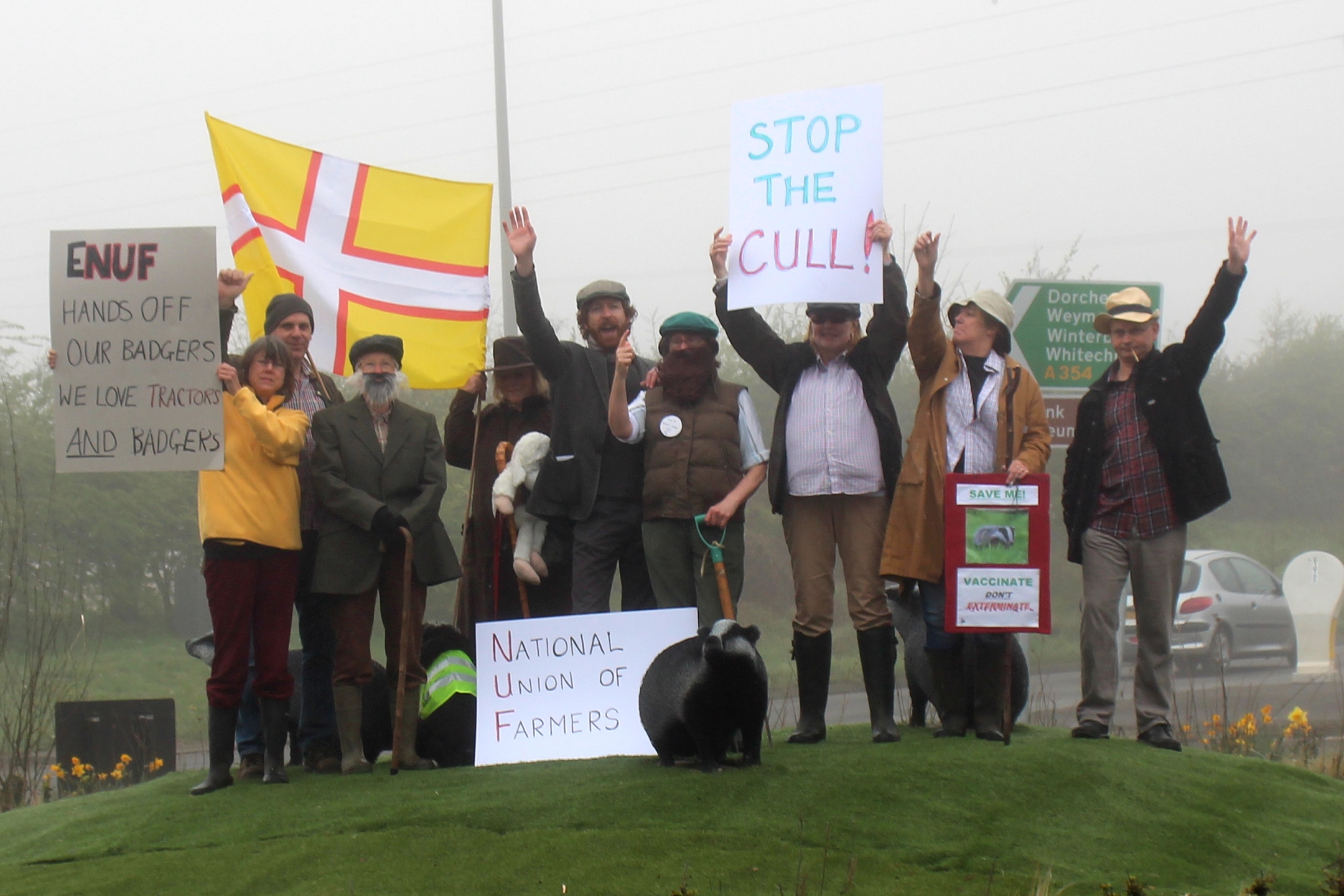 Members of the Dorset branch of the National Union of Farmers (NUF) today protested against the proposed cull of badgers in the county by taking over the Badger Roundabout on the Blandford bypass. The farmers say they want to live up to their image as guardians of the countryside by abandoning their “if it moves, kill it” attitude and embracing a policy of encouraging biodiversity and protecting wildlife instead.